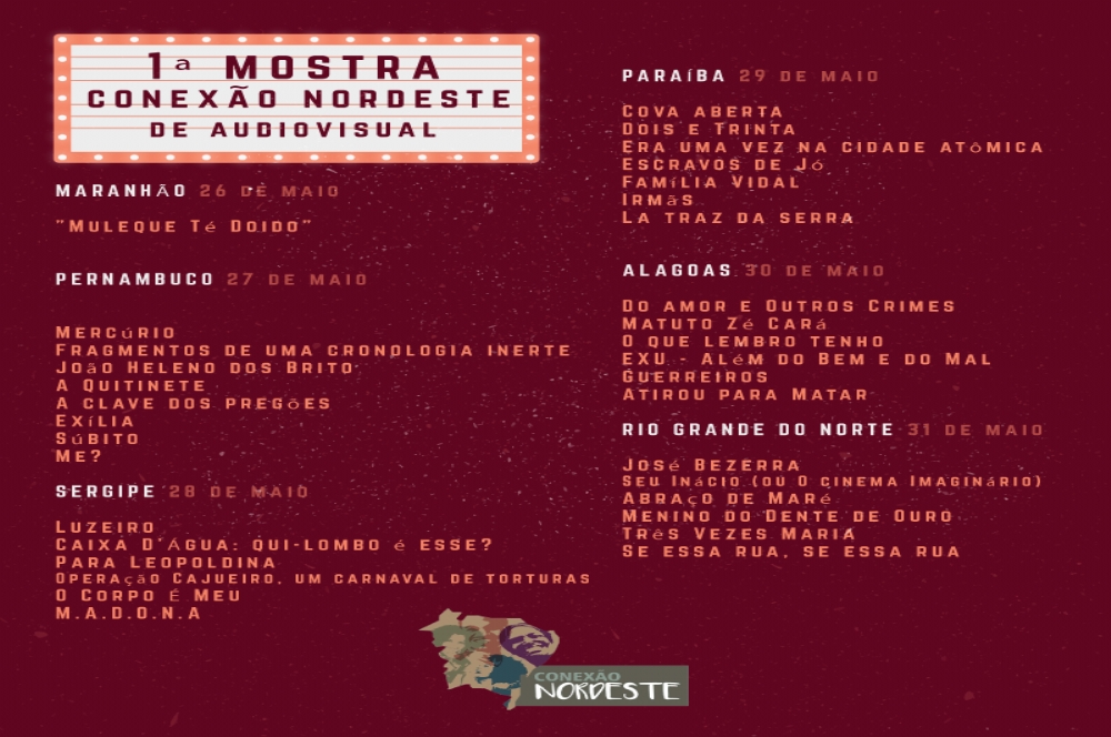 A diversidade do cinema produzido na região Nordeste será exibida na 1ª Mostra Conexão Nordeste de Audiovisual, que acontece entre os dias 27 de maio a 1º de junho, simultaneamente nos Estados de Alagoas, Sergipe, Pernambuco, Rio Grande do Norte, Paraíba e Maranhão.
