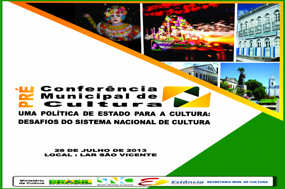 A Prefeitura Municipal de Estância, através da Secretaria Municipal de Cultura, Juventude e Desporto, tendo como secretário, o professor Miguel Viana, realizará na próxima sexta-feira, 26, ás 19h00 no Lar São Vicente, a Pré-Conferência Municipal de Cultura. O Lar São Vicente, fica localizado à Rua Gumersindo Bessa, centro de Estância.