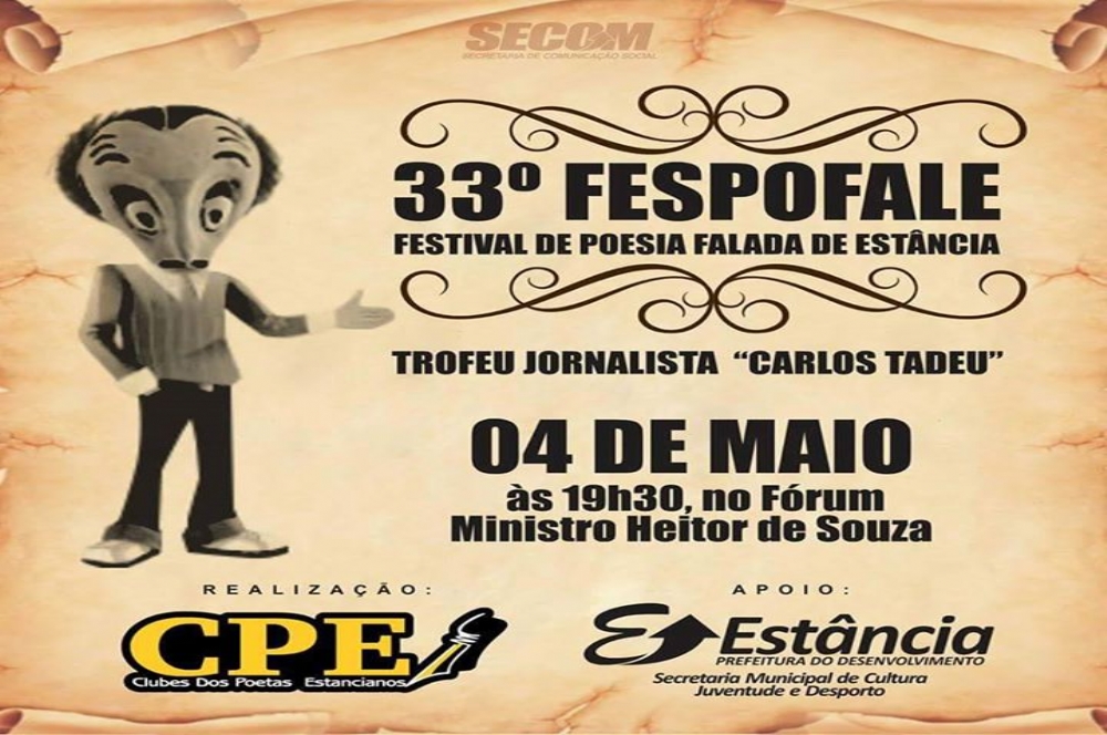 O Clube dos Poetas Estancianos, a entidade que completou 24 anos de fundada realizará no dia 4 de maio a XXXIII edição do Concurso de Poesia Falada (FESPOFALE) – Troféu Carlos Tadeu, o evento reúne poetas locais, do interior sergipano e da nossa capital.