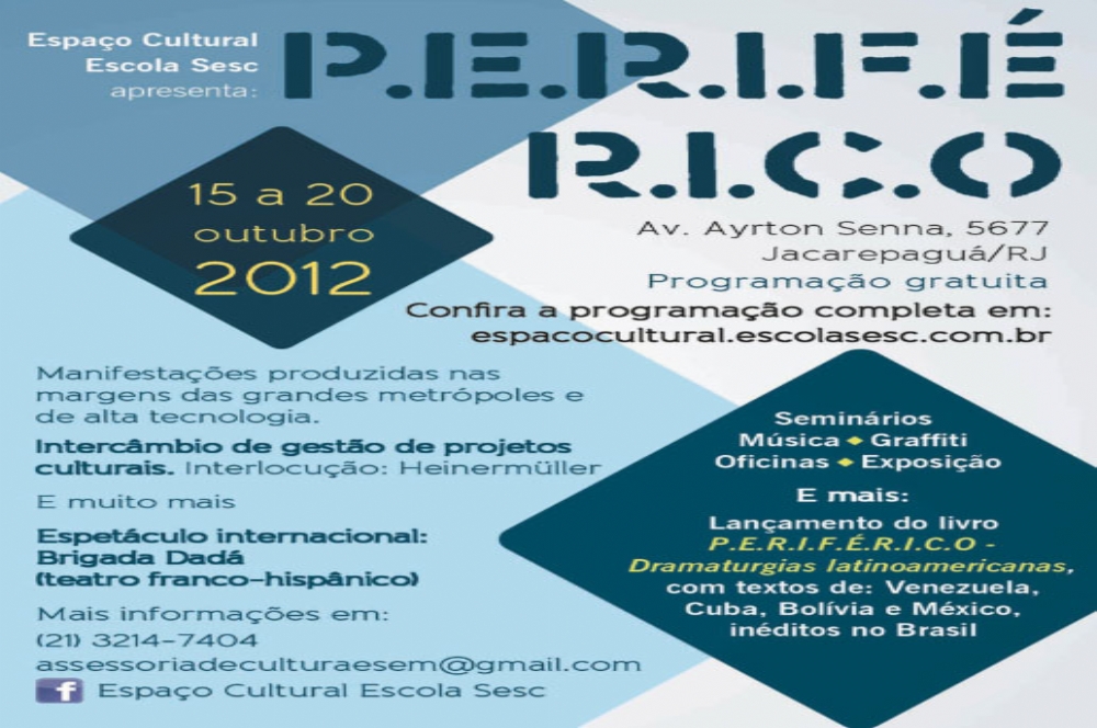 A programação de P.E.R.I.F.É.R.I.C.O é composta por um seminário sobre cultura periférica, além da produção e inauguração de uma galeria urbana a céu aberto, e da realização de atividades culturais em escolas públicas, de leituras dramáticas e do lançamento da publicação de textos latino-americanos inéditos em português. Haverá também uma mostra internacional de teatro, uma oficina de fotografia e DJ, e, por fim, um show musical e noite performática.