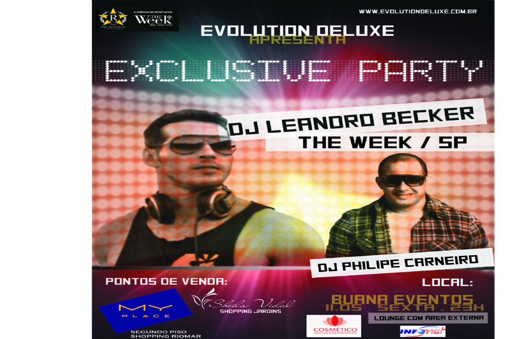 A Evolution Deluxe, que no ano passado trouxe para Aracaju o Ibiza World Club Tour, realiza mais um evento em nossa cidade: o Exclusive Party que acontecerá no dia 11 de Maio no Buana Eventos e contará com a participação dos Dj’s Leandro Becker (The Week/ SP) e Philipe Carneiro (Sergipe).