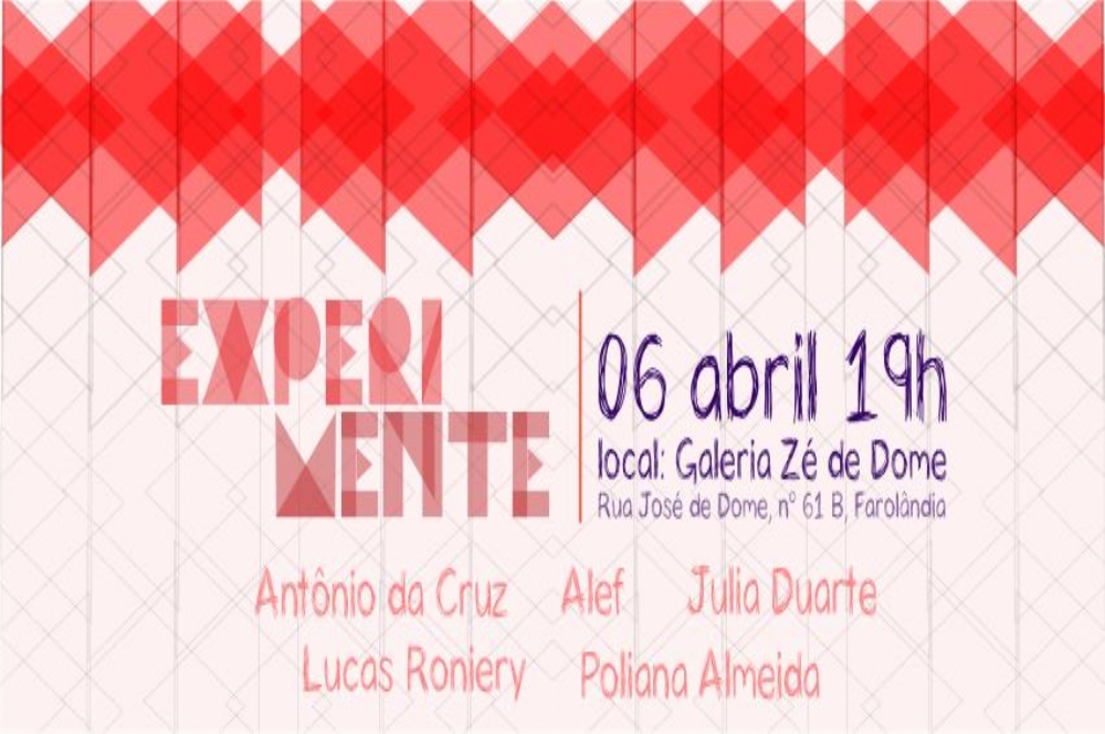 A partir dessa quarta, 06 de abril, a galeria Zé de Dome faz o lançamento do Experimente, projeto idealizado pelo artista e produtor cultural Fábio Sampaio que prevê 09 exposições até dezembro de 2016. A ideia é proporcionar ao público, a cada edição do projeto, uma nova experiência a partir de uma exposição coletiva, uma ação performática e um bate-papo. Ao todo serão mais de 50 artistas de diferentes gerações experimentando e intensificando ações para promoção, fomento, troca e reflexão sobre arte e cultura na contemporaneidade.