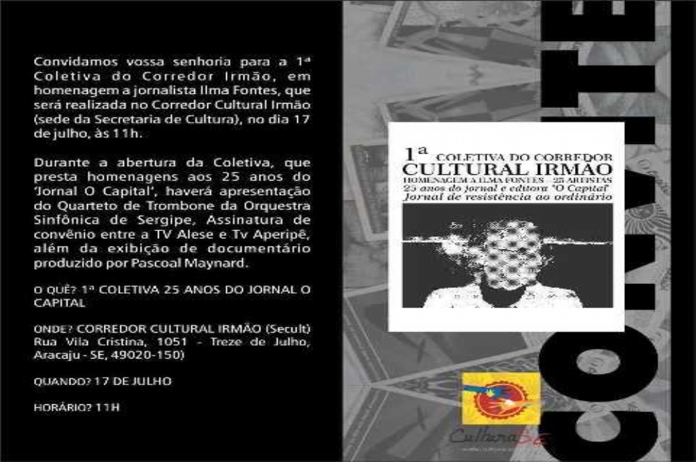 A Secretaria de Estado da Cultura promove no dia 17 de julho a “1ª Coletiva do Corredor Irmão”. Com obras de diversos artistas sergipanos, a exposição presta uma homenagem aos 25 anos do Jornal “O Capital”, através da jornalista e editora do impresso, Ilma Fontes. Ao todo a mostra reúne 25 peças entre pinturas, desenhos e fotografias.