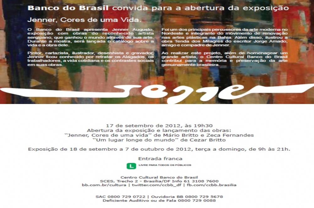O evento será realizado, em grande estilo, no Centro Cultural do Banco do Brasil – CCBB, no próximo dia 17 de setembro (segunda-feira). Além do livro, haverá uma exposição com 20 obras de Jenner, que ficará em cartaz até o dia 07 de outubro, com visitação gratuita.