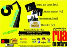 Realizada com o apoio da Prefeitura de Aracaju, a Rua da Cultura recebe mais uma edição do ‘Circuito Fora do Eixo”, uma rede colaborativa de coletivos de cultura distribuídos pelo Brasil. Na próxima segunda, 8, a partir das 18h, se apresentam no palco montado do mercado municipal as bandas Bruno das Gerais (MG), Joseph Tourton (PE) e Mamutes (SE), além da internacional Falsos Conejos, da Argentina.