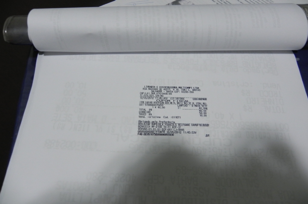 | Cópia da nota fiscal comprovando a venda do livro em uma livraria de Salvador (BA) |