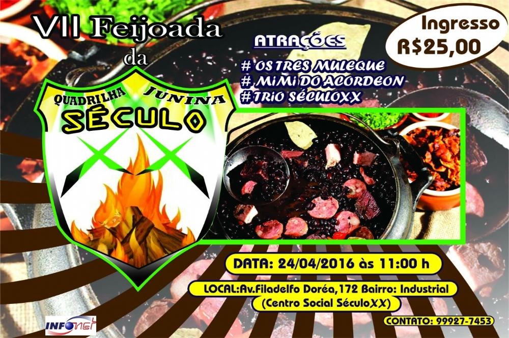 A Quadrilha Junina Século XX vai realizar no domingo, 24 de abril, a 7ª edição da sua tradicional da feijoada. O evento está marcado para às 11h no Centro Social Século XX, que fica no b