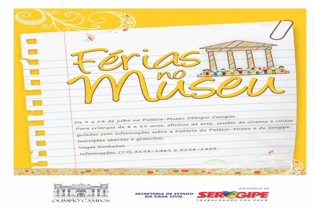 O Palácio-Museu Olímpio Campos (PMOC) está com inscrições abertas para o Projeto “Férias no Museu”, uma iniciativa do PMOC que visa proporcionar às crianças com idade entre 8 e 11 anos atividades lúdicas e educativas durante uma semana no Palácio-Museu. A edição 2012 acontece de 09 a 13 de julho, com turmas pela manhã e tarde. As vagas são limitadas e as inscrições gratuitas.