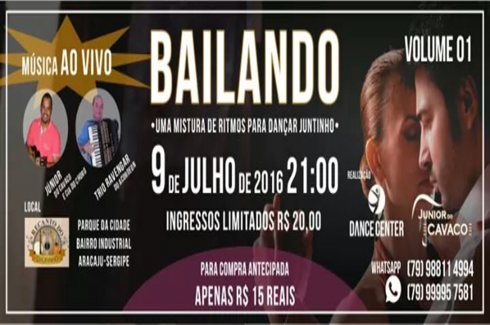 Dia 09 de Julho, às 21h, o Bar e Restaurante Recanto do Chorinho terá a satisfação de receber a Primeira Edição da Festa "Bailando". O evento idealizado por Júnior do Cavaco, em parceria com a escola de dança "Dance Center", promete ser um dos mais agitados da cidade reunindo todos ritmos musicais.
