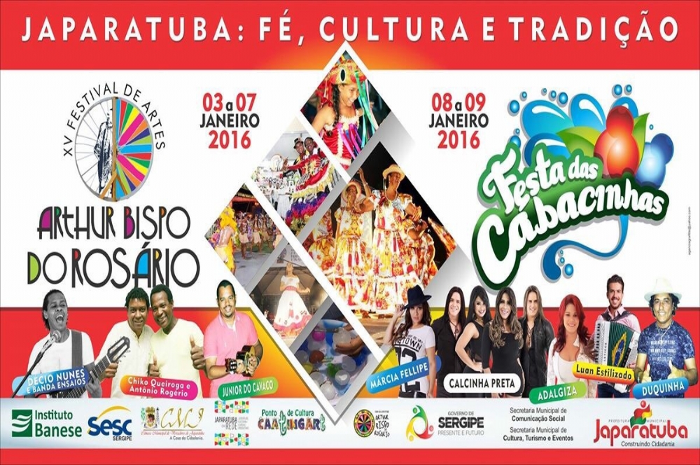 O município de Japaratuba, distante 54 km de Aracaju, começa o ano de 2016 recebendo dois grandes eventos: a 15ª edição do Festival de Artes Arthur Bispo do Rosário, que acontece de 03 a 07 de janeiro, e a tradicional Festa das Cabacinhas, realizada nos dias 08 e 09 do mesmo mês.