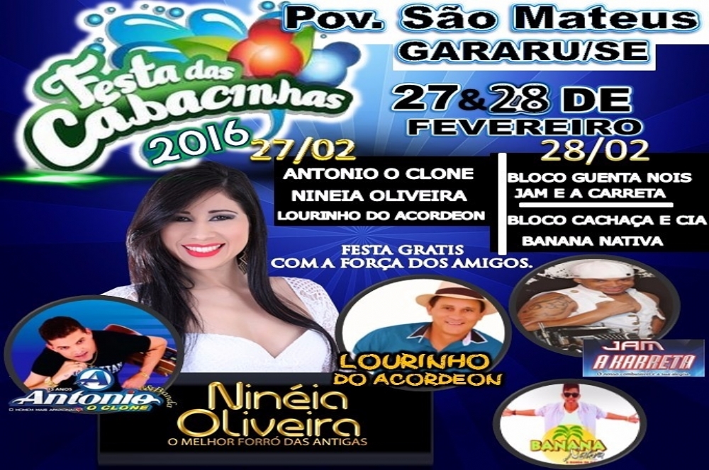 A cantora Nineia Oliveira promete agitar a Festa das Cabacinhas do povoado São Mateus, que fica na cidade de Gararu. O evento, que é tradicional na região, acontece nos dias 27 e 28 de fevereiro, e ainda conta com shows de Lourinho do Acordeon, Antônio o Clone, além de Jam e a Carreta no comando do bloco Guenta Nois e Banana Nativa no bloco Cachaça e Cia.