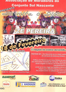 A Associação de Moradores do Conjunto Sol Nascente realiza no próximo dia 18, a partir das 14h, uma festa para resgatar os antigos carnavais. Com o tema ‘De Volta o Bloco Zé Pereira’, o evento promete que terá o maior salão de carnaval de todos os tempos, trazendo aos foliões tradições que marcaram época, mas que foram se apagando no tempo por conta da invasão dos carnavais elétricos.