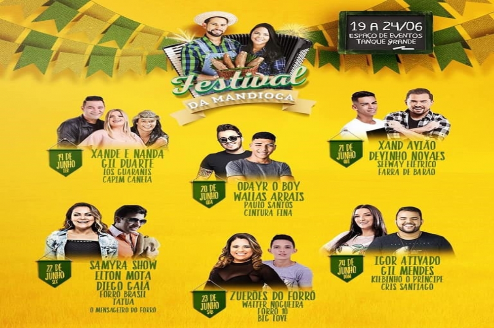 A 4ª edição do Festival da Mandioca vai reunir grandes atrações na cidade de Lagarto. A festa acontece entre os dias 19 e 24 de junho.