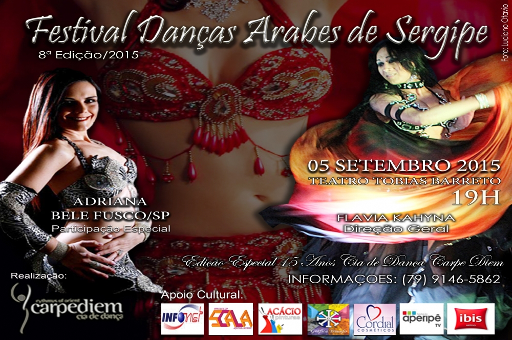 O Festival Danças Árabes de Sergipe chega a sua 8ª edição este ano, e no dia 5 de setembro, ás 19h, fará uma grande festa no Teatro Tobias Barreto. A capital sergipana vai se tornar mais uma vez palco da cultura oriental, reunindo bailarinas (os) de todo o Estado e vindos também de diferentes cidades do Brasil, um momento de celebração a arte, convivência e formação.