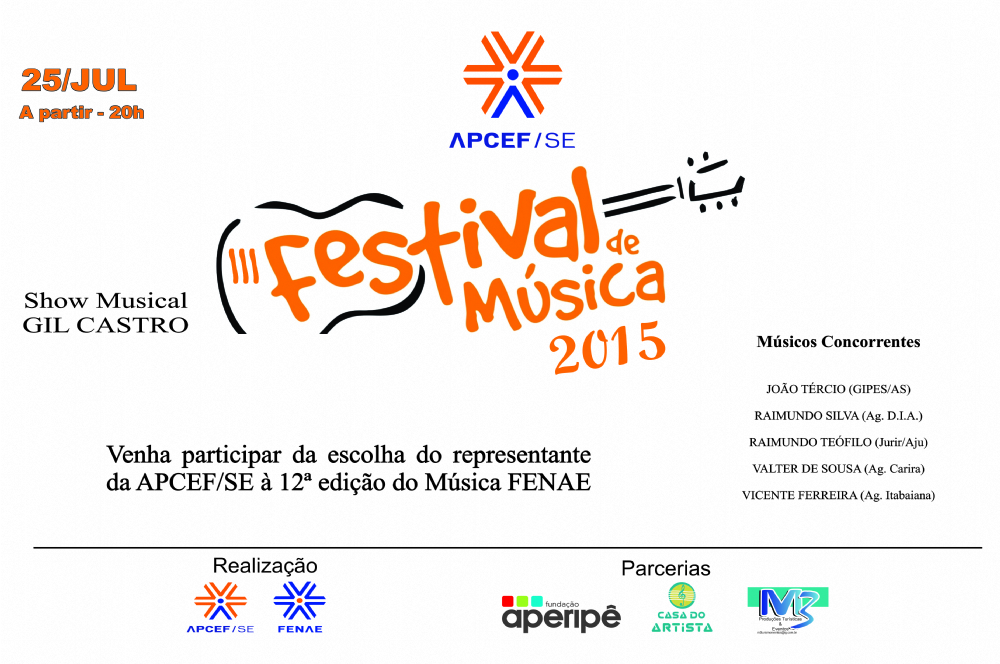 Às 20h do sábado, dia 25 de julho, a Associação do Pessoal da Caixa (APCEF/SE) realiza o Festival de Música da APCEF/SE no Clube da CAIXA/SE, localizado na Av. Melício Machado, Nº 800, bairro Aeroporto, Aracaju/SE. A entrada é franca e a noite também será animada pelo show de Gil Castro e o Coral da Unimed.