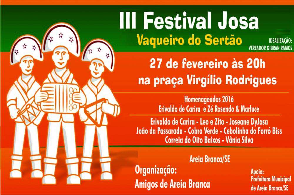 O III Festival de Música Pé de Serra ‘Josa – o Vaqueiro do Sertão’ vai homenagear Erivaldo de Carira e Zé Rosendo e Marluce. O evento acontece neste sábado, 27, a partir das 20h, na cidade de Areia Branca.