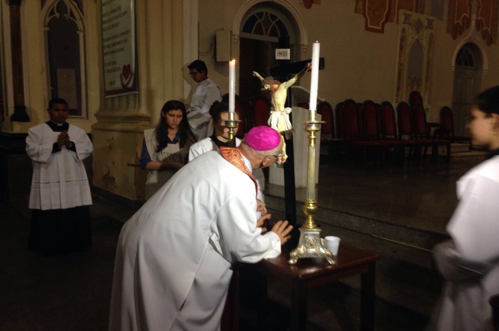 No ponto alto da celebração, os católicos fizeram filas para beijar a cruz que significa adorar a Jesus que foi pregado na cruz.