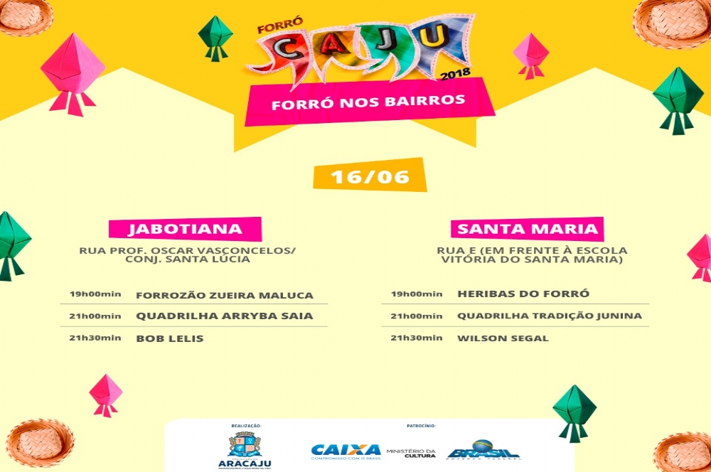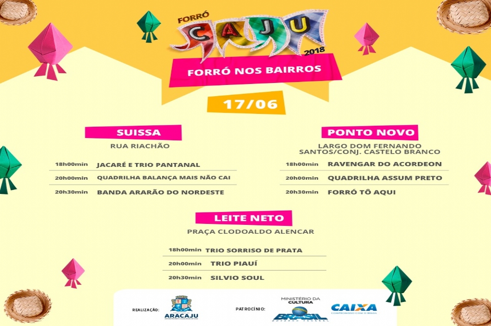 As bandeirolas foram colocadas, os chapéus de palha separados para montar o visual e os bigodes e sardas estão sendo desenhados na criançada. Os festejos juninos de Aracaju começaram e trouxeram, de forma inédita, o Forró Caju nos bairros, além da programação anunciada para os palcos Luis Gonzaga, Gerson Filho e Rua de São João. Neste final de semana, a população poderá aproveitar o melhor do forró e da tradição nordestina.