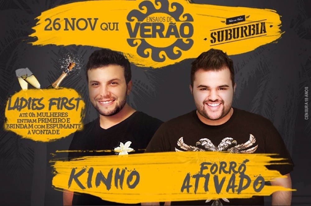 A quinta-feira, 26, terá mais uma edição dos Ensaios de Verão no Suburbia. Quem agita a noite são as bandas Forró Ativado e Kinho, a partir das 23 horas. Nesta quinta, a novidade é que até a meia-noite as mulheres entram primeiro e brindam com espumante a vontade.