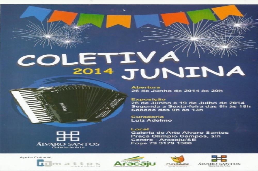 Dentro das atividades da Fundação Cidade de Aracaju (Funcaju) durante período de São João, a Galeria de Arte Álvaro Santos realiza nesta quinta-feira, 26, mais uma edição Coletiva Junina. "Este evento acontece a mais de 20 anos na Álvaro Santos e estamos muito felizes por dar continuidade a esta tradição" afirma o diretor da Galeria, Luiz Adelmo Soares.