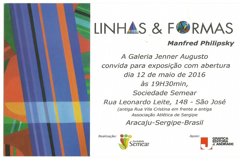 No próximo dia 12 de maio, às 19h30, será aberta na Galeria Jenner Augusto a exposição “Linhas & Formas”, do artista Alemão Manfred Philipsky, apresentando quadros com uma composição de cores e formas geométricas, dando margem a liberdade da interpretação do observador. As musicas, as viagens e a natureza são inspiradores para a composição das obras, que misturam a geometria e a abstração informal. A exposição fica em cartaz até o dia 03 de junho.