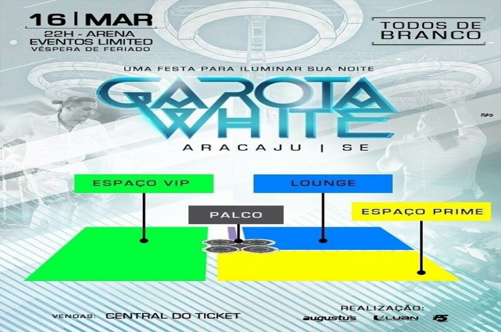 A capital sergipana receberá o novo projeto de Wesley Safadão: Garota White. O evento, que já foi sucesso em Teresina/ PI, Fortaleza/ CE, João pessoa/ PB e Belém/ PA, acontecerá em Aracaju no dia 16 de março, véspera de feriado. Garota White é a festa conceito do cantor Wesley Safadão em que todos os convidados e o próprio cantor se vestem de branco.