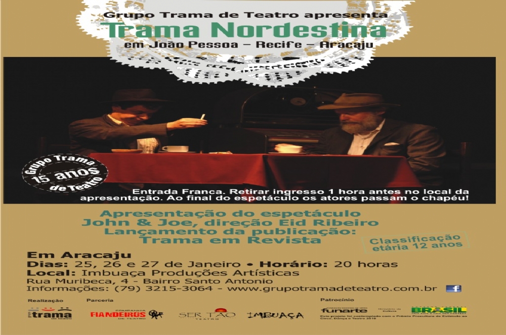 O grupo de teatro Trama nordestina realiza Circulação do Espetáculo John & Joe. O lançamento acontece em João Pessoa, Recife e Aracaju. Ao final do espetáculo os atores passam o chapéu! Retirar ingresso 1 hora antes no local da apresentação. Informações: (79) 3215 3064. Confira o site.