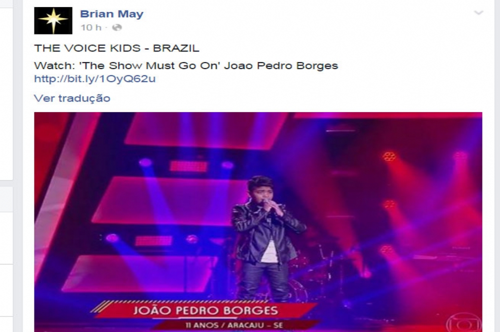 O guitarrista da banda Queen, Brian May, postou em sua fanpage o vídeo do cantor de 11 anos que escolheu a música da banda para a seleção do The Voice Kids Brasil 2016. O sergipano João Pedro Borges, conquistou os técnicos ao interpretar a música ‘The show must go on” e teve as cadeiras de Ivete Sangalo e Carlinhos Brown viradas.