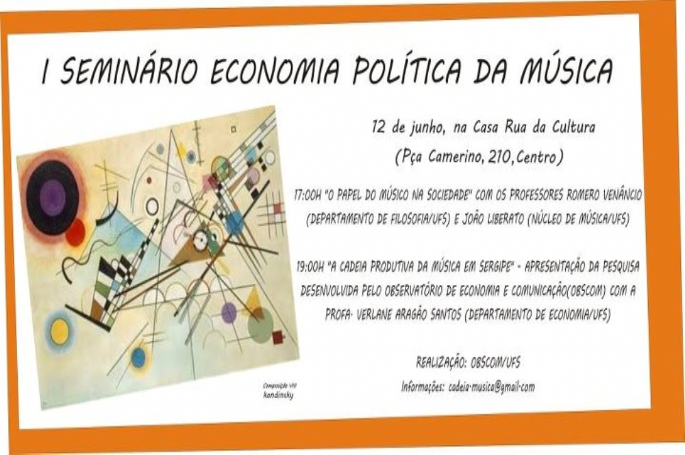 Na próxima terça-feira, 12, a partir das 17h, na Casa Rua da Cultura, acontecerá o I Seminário de Economia Política da Música onde serão discutidos os seguintes temas: “O papel do músico na sociedade” e “A Cadeia produtiva da música em Sergipe” – ambos coordenados por Professores da Universidade Federal de Sergipe.