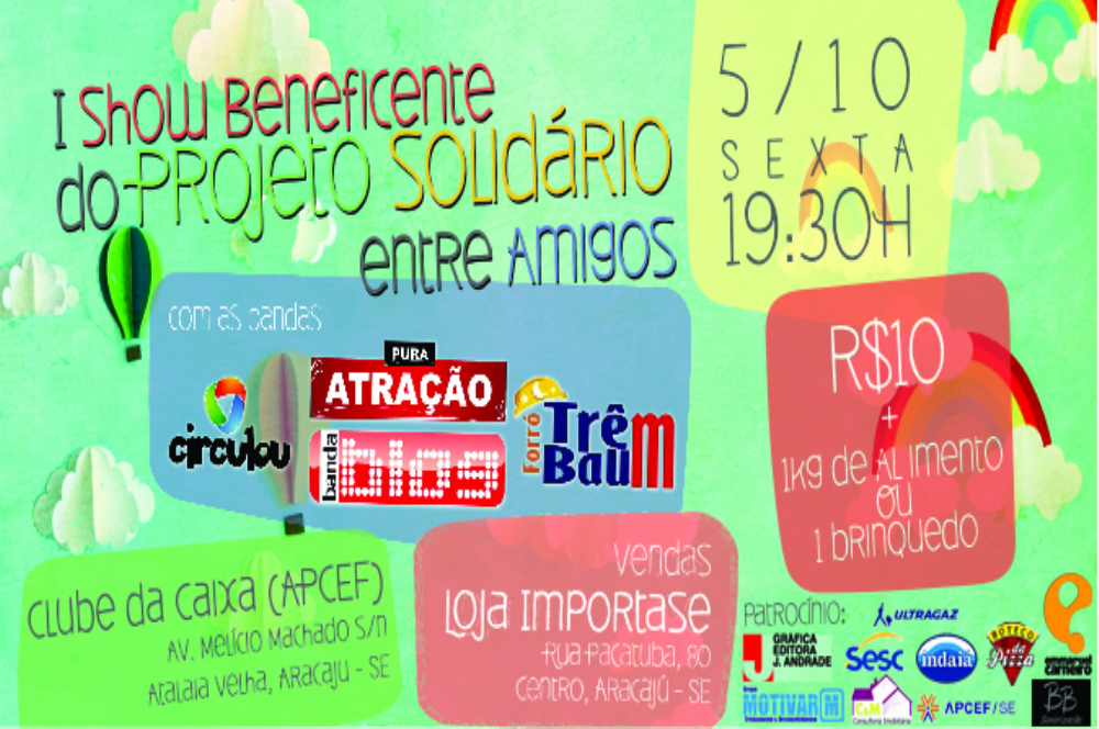 No dia 5 de outubro será realizado o I show beneficente do Projeto Entre Amigos com as bandas de forró Trem Baum, Circulou, Blog e Pura Atração. O evento acontecerá às 19h30 no Clube da Caixa. Pontos de vendas: Lojas Importanse, localizada na rua de Pacatuba e Academia Demarques que fica ao lado da renovadora de pneu Ponto Novo.