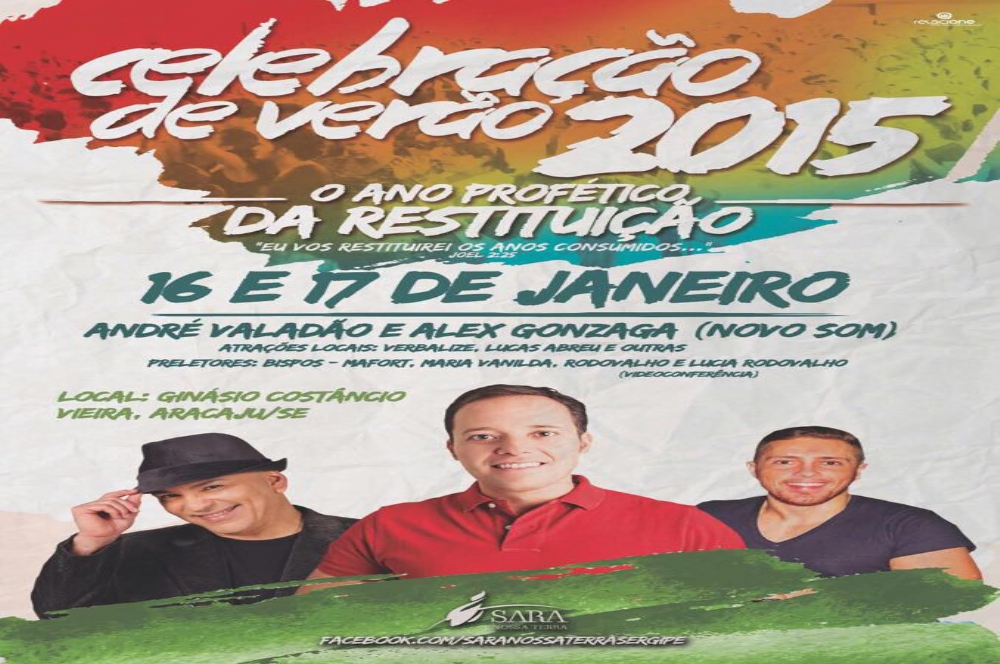 A Celebração de Verão do Ministério Sara Nossa Terra, realizada há mais de 20 anos em Brasília (sede nacional da Igreja), chega a sua 8º edição em Sergipe e acontece nos dias 16 e 17, no Ginásio Constâncio Vieira a partir das 18h. Nesta edição, o público terá a oportunidade de adorar junto ao cantor e pastor André Valadão, um dos maiores nomes da música gospel no país e o integrante da banda Novo Som, Alex Gonzaga, dono de uma voz privilegiada.
