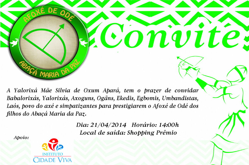 O Abassá Maria da Paz realiza no próximo dia 21 de Abril, segunda-feira, o Afoxé de Odé. O evento está em sua terceira edição e traz a magia dos tradicionais afoxés ao som dos atabaques e agogôs do povo de Odé. Um evento cultural e religioso que busca congregar adeptos, simpatizantes, autoridades e todo o povo de santo. O Afoxé já faz parte no calendário cultural oficial do município de Nossa Senhora do Socorro.