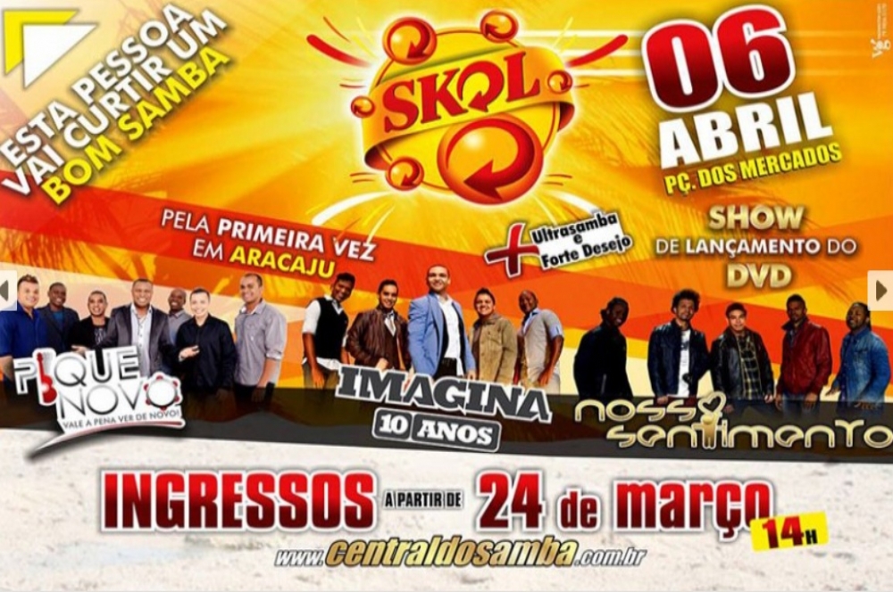 Imagina Samba, Nosso Sentimento e Pique Novo em Aracaju. O show acontece no dia 6 de abril a partir das 17h na Praça dos Mercados, na capital sergipana. Classificação etária 18 anos.