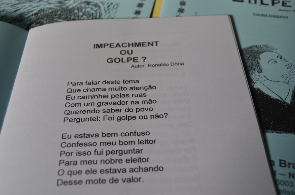Além da cultura nordestina, os cordeis são bastante atuais e narram o cenário político brasileiro. É o caso do “Impeachment ou Golpe”, de Ronaldo Dória, que conta que saiu às ruas com um gravador na mão entrevistando os eleitores acerca da questão.