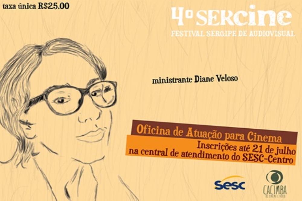 O Sercine, Festival Sergipe de Audiovisual informa que estão abertas as inscrições para a oficina de Atuação para Cinema, ministrada pela atriz sergipana Diane Veloso e que acontece de 21 a 24 de julho, no SESC, das 14h às 18h. As inscrições acontecerão de 26 de junho a 21 de julho, na Central de atendimento do Sesc Centro, que fica na Rua Dom José Thomaz, São José, das 08h as 18h, taxa única de R$ 25, que será paga no ato da inscrição.