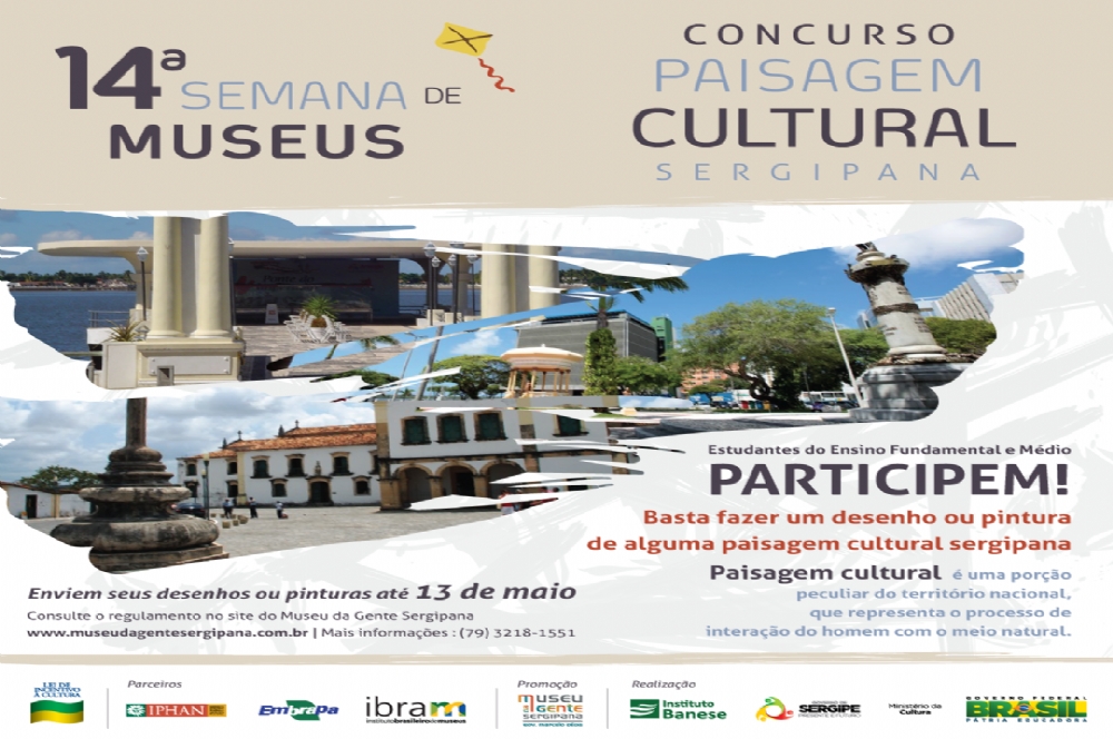 A 14ª Semana Nacional de Museus está chegando e como parte da programação do Museu da Gente Sergipana Governador Marcelo Déda, o Governo do Estado, através do Instituto Banese, em uma promoção do Museu da Gente Sergipana e em parceria com o Instituto do Patrimônio Histórico e Artístico Nacional (Iphan) e a Empresa Brasileira de Pesquisa Agropecuária (Embrapa), lançam o concurso ‘Paisagem Cultural Sergipana’, voltado para estudantes do Ensino Fundamental e Médio.