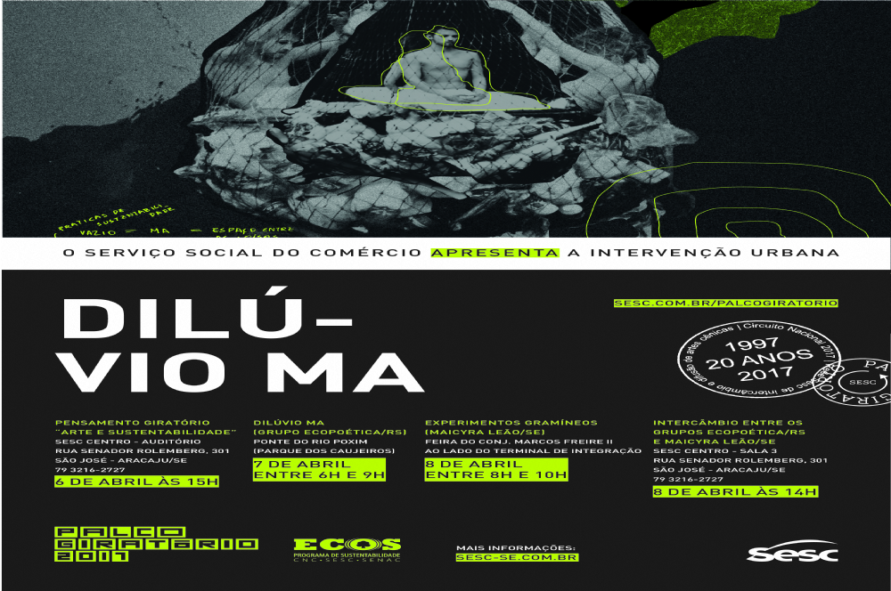 Nessa sexta-feira, 7, chega a Aracaju a primeira etapa do Projeto Palco Giratório, com a intervenção urbana Dilúvio MA, do grupo Ecopoética (RS). O evento ocorre das 6h às 10h, na Ponte do Rio Poxim (Parque dos Cajueiros), com os performes pendurados em uma rede cheia de lixo.