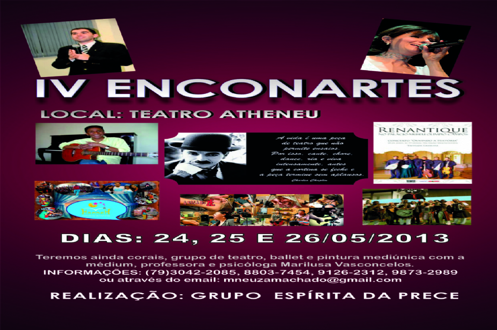 O IV Enconartes acontece de 24 a 26 de maio no Teatro Atheneu. O evento contará com três shows musicais de artistas vindo de São Paulo. O tenor, Allan Vilches; Margarete Áquila formada em música com especialização em canto e Moacyr Camargo cantor e compositor que tem seis CD´s gravados.