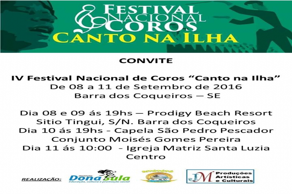 A Barra dos Coqueiros se tornará a capital do Canto Coral do nosso Estado. De 08 a 11 de setembro, a cidade recebe 26 corais de Sergipe, da Bahia e de Alagoas para a realização da quarta edição do Festival Nacional de Coros – Canto na Ilha. Ao longo de quatro dias, a população de Barra dos Coqueiros e de todo o Estado poderá conferir, gratuitamente, as apresentações, que se concentrarão nesta quinta e sexta a partir das 19 hs no Hotel Prodigy, neste sábado, no mesmo horário, no Salão Irmã Eleonora da Igreja São Pedro Pescador, e neste domingo a partir das 10hs, na igreja de Santa Luzia, na Barra dos Coqueiros. A realização é da organização não governamental Instituto Dona Sula.