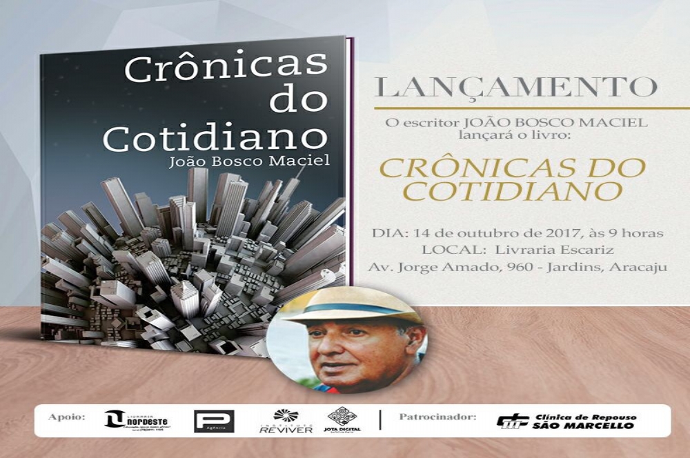 O escritor João Bosco Maciel vai lançar o seu segundo livro no dia 14 de outubro, às 9 horas, na livraria Escariz da Avenida Jorge Amado no bairro Jardins. Com o título de Crônicas do Cotidiano, o livro mostra que eventos simples do cotidiano transformam-se em reflexões profundas nas mãos do escritor, que é dotado de uma grande sensibilidade para expressar o mais intimo do ser humano.