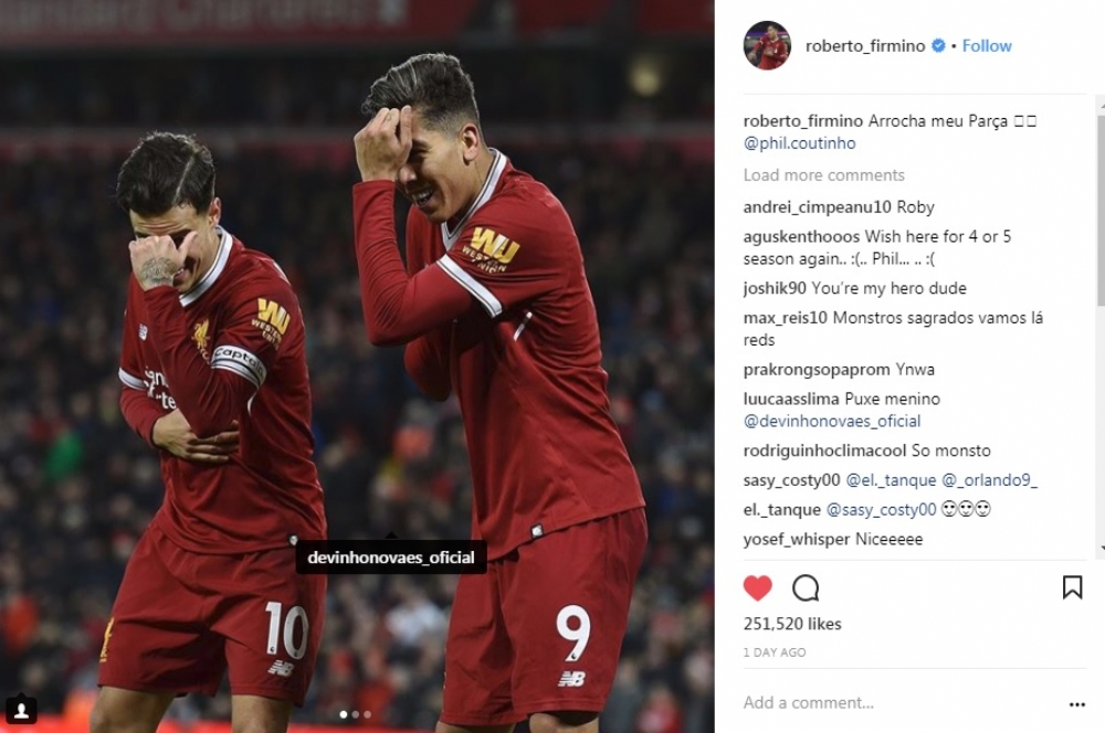 | Sucesso de Devinho chega à Europa: brasileiros do Liverpool comemoram gol dançando arrocham e marcam artista em publicação (Imagem: Reprodução/Instagram @roberto_firmino) |