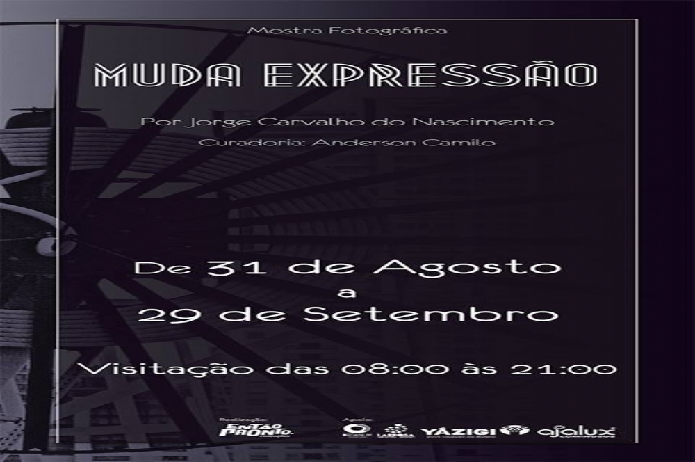 Acontece entre os dias 31 de agosto a 29 de setembro, no Espaço Cultural Yázigi o resultado da pesquisa MUDA EXPRESSÃO, do diletante Jorge Carvalho do Nascimento, realizada pela dupla da Então Pronto Produções. Uma proposta audaciosa, onde uma equipe de profissionais de diversas áreas cumpre o desafio de imprimir uma coerência visual aos elementos expostos e apresentados.