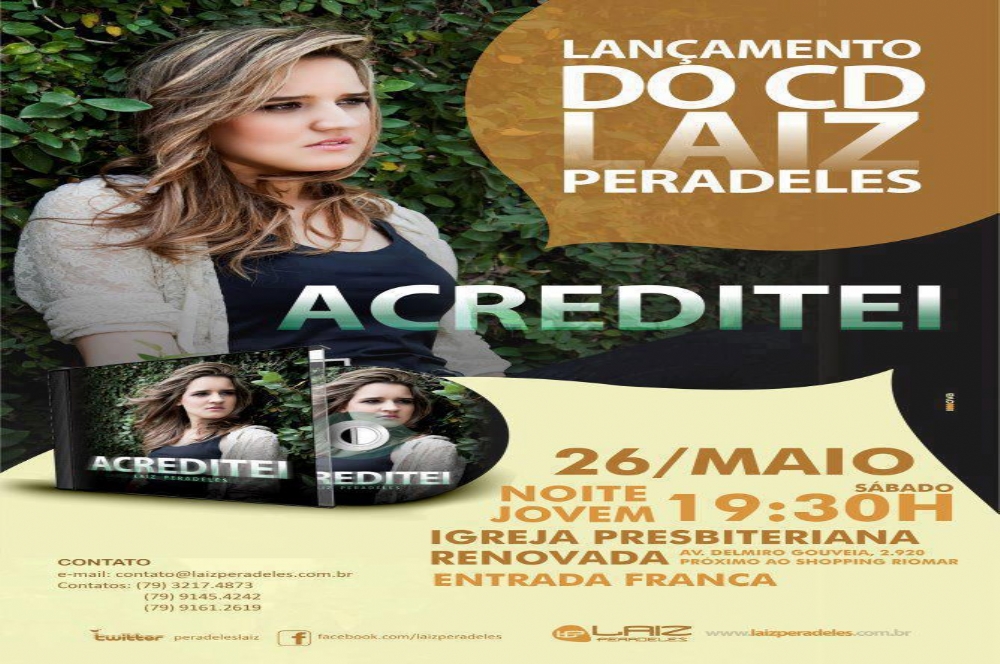 Neste sábado, 26, a cantora gospel Laiz Peradeles, de 22 anos, lança o CD Acreditei. O lançamento será realizado na avenida Delmiro Gouveia, 2920, às 19h30, na Igreja Presbiteriana Renovada. A entrada é franca e quem for ao lançamento vai poder conferir o talento da cantora que se apresenta profissionalmente desde os sete anos de idade e já passou por programas nacionais como Raul Gil e Ídolos.