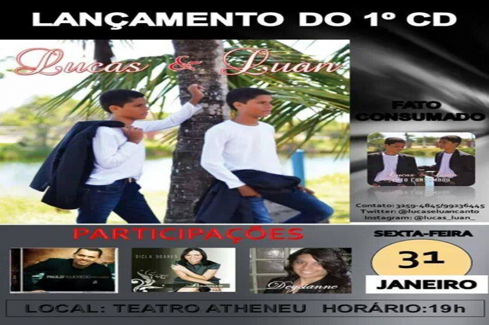 Nesta sexta-feira, 31, às 19h no Teatro Atheneu tem o Lançamento de CD: 'Lucas & Luan – Fato Consumado'. Os garotos são cantores do segmento gospel. O show é entrada franca e contará com a participação de outros artistas.