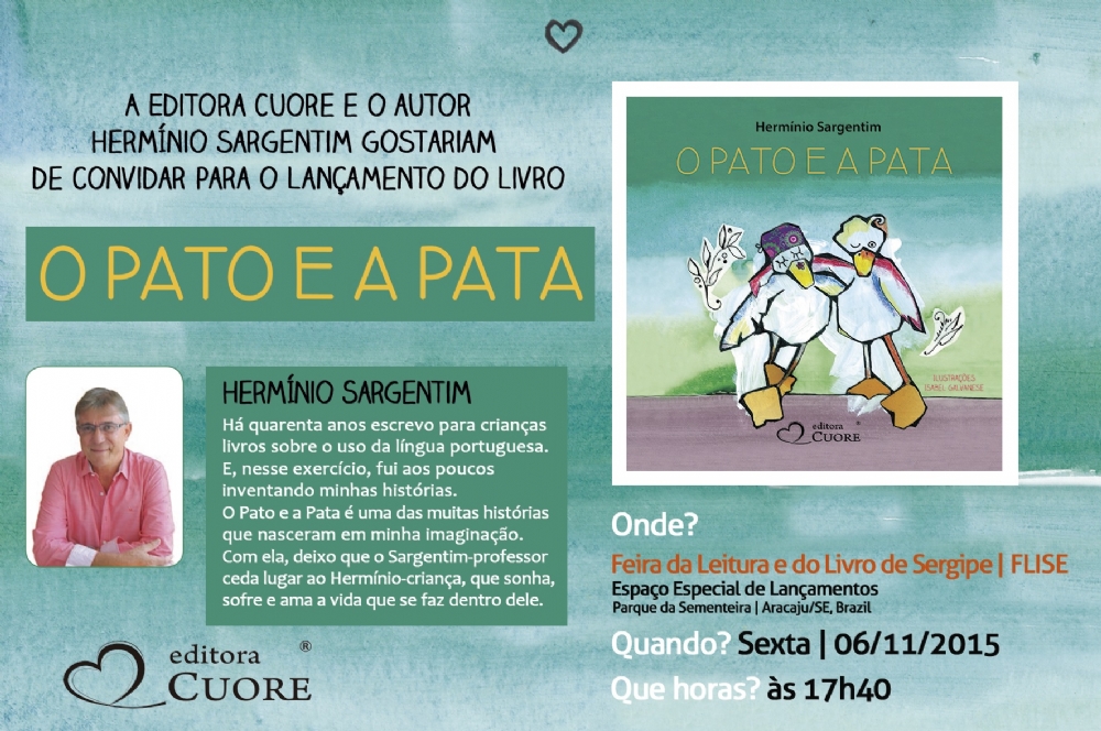 O escritor de livros didáticos de Língua Portuguesa, dicionários, gramáticas e literatura infantojuvenil, Hermínio Sargentim, estará lançando o seu novo livro infantil, "O Pato e a Pata", na Feira da Leitura e do Livro de Sergipe – FLISE, na sexta-feira,6, às 17h40min, no Parque da Sementeira.
