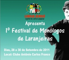 Prosseguem até 20 de agosto de 2011, as inscrições para o I Festival de Monólogos de Laranjeiras, que se realizará nos dias 28 a 30 de Setembro deste ano. As inscrições deverão ser realizadas em dias úteis, no horário das 08h às 17h, na Secretaria Municipal de Cultura, situada na Praça Samuel de Oliveira, 241 – Centro – 49.170-000, em Laranjeiras, pessoalmente, através dos Correios ou pelo email.