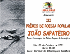 Prosseguem até o dia 20 de setembro as inscrições para o III Prêmio de Poesia Popular João Sapateiro, promovido pela prefeitura de Laranjeiras, através da secretaria municipal de Cultura. As inscrições deverão ser feitas pessoalmente na Secretaria de Cultura, situada a Praça Samuel de Oliveira, 241 – Centro – 49.170-000, em Laranjeiras.