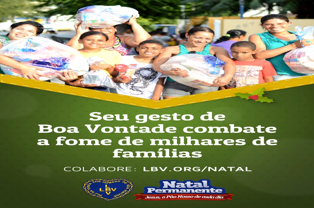 Com o objetivo de oferecer um Natal mais digno e feliz a milhares de famílias em situação de vulnerabilidade social, a Legião da Boa Vontade promove a edição 2015 da Campanha Natal Permanente da LBV — Jesus, o Pão Nosso de cada dia!. A iniciativa visa arrecadar mais de 900 toneladas de alimentos não perecíveis a serem entregues, em cestas, no período de 7 a 23 de dezembro, a 50 mil famílias atendidas pelos programas socioeducacionais da LBV e as apoiadas por organizações parceiras da Instituição em todo o Brasil.