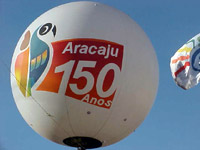 Os foliões do Pré-Caju 2005 curtem as atrações do axé-music observando a logomarca que caracteriza os 150 anos da cidade de Aracaju. A marca traz consigo os elementos gráficos que traduzem as riquezas da capital: a arara e o caju.