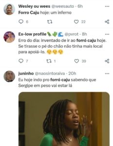 “Se tirasse o pé do chão não tinha mais local para apoiá-lo”, brincou um internauta numa rede social. “Morar no país do forró é muito complicado, só queria curtir o Forró Caju sem ninguém pisando no meu pé”, escreveu uma forrozeira. Outro internauta brincou com o calor que fazia na festa. “Senti minha alma saindo do corpo umas 30 vezes”, debochou.